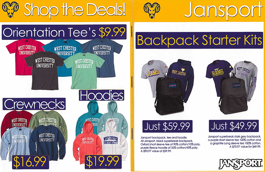 WCU Bookstore produces a booklet to accompany student orientation. In addition to spreads depicting special orientation merchandise and promotions, the booklet includes the itenerary for WCU's official New Student Orientation as well as information on various bookstore programs.