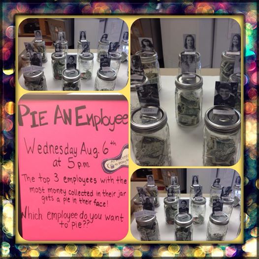 A few weeks before the Relay for Life event, the staff put out jars with a picture of each volunteer on the counter. The community then “voted” by placing donations into the jar of the employee that they wanted to see get a pie in the face. The initial idea for the “Pie an Employee” fundraiser came from staff member Tim, who had participated in a similar event at his fraternity.
