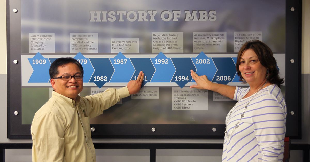 That became immediately apparent when they walked by MBS' company timeline during their most recent of many tours in our Columbia, Missouri warehouse. From green screen to GUI and from print to digital, they saw MBS change as it evolved with emerging technologies and continued to shape college retail, and spent time last week between systems training sessions reminiscing over the past two decades in the college retail business.