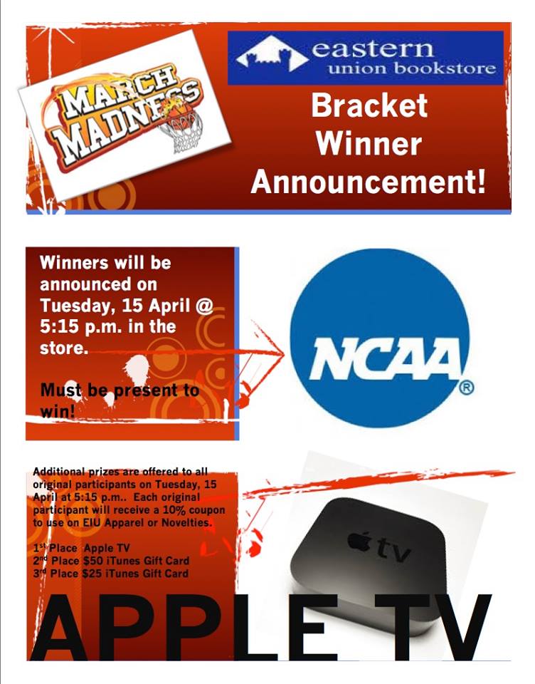 “We advertised in store, on Facebook and around campus, encouraging students to stop by and fill out a bracket to enter,” Brandon explained. “Once they completed it, they simply had to turn it in to the store. Throughout the tournament, we scored all the ones we collected to determine our top three winners.”