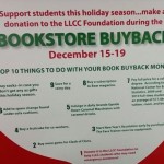 LLCC Bookstore staff promoted the event with a sign next to a collection jar. The sign used humorous topical or holiday-themed suggestions for things students can do with their buyback money, including buying socks (in case you don’t get any as holiday gifts), or scoring more gems for Clash of Clans. The top suggestion, of course, was to donate to the fund.