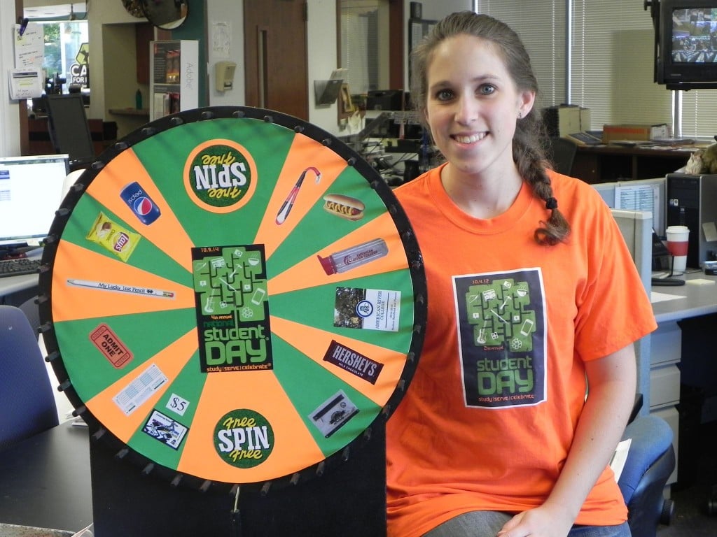 Liam Callahan, Marketing Coordinator and Customer Service Clerk: Our event consisted of sales, live music, giveaways and raffles, as well as appearances by campus organizations and the Humane Society. Students who attended the event were able to enter into a raffle to win prizes which included an iPad Mini, store gift basket, apparel, snack baskets from our vendors, and coupons donated by area businesses — more than 200 students entered to win. We also had a prize wheel where students could spin to win a variety of prizes.