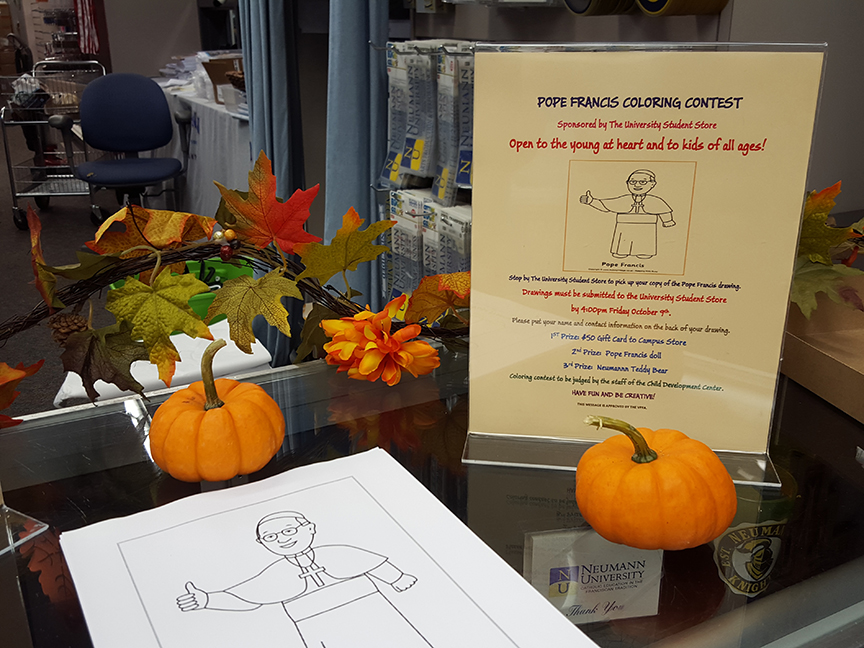 Prizes for the coloring contest included a $50 gift certificate to the store, a Pope Francis doll and a Neumann University teddy bear.