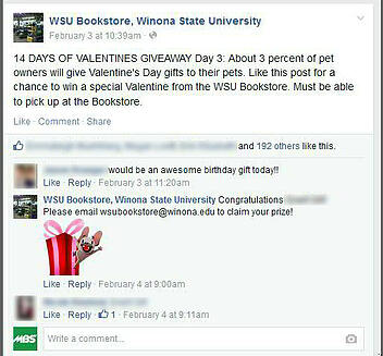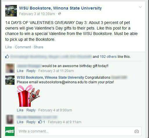 It’s pretty clear: love is definitely in the air at college stores all over the country. With less than a week to go before Valentine’s Day, suggestions for romantic gifts, requests for “meet cute” anecdotes and holiday sales are filling up our newsfeed on a regular basis. This year it seems like more stores than ever are actively using Facebook to promote their efforts — like the WSU Bookstore, with their “14 Days of Valentines Giveaway.”